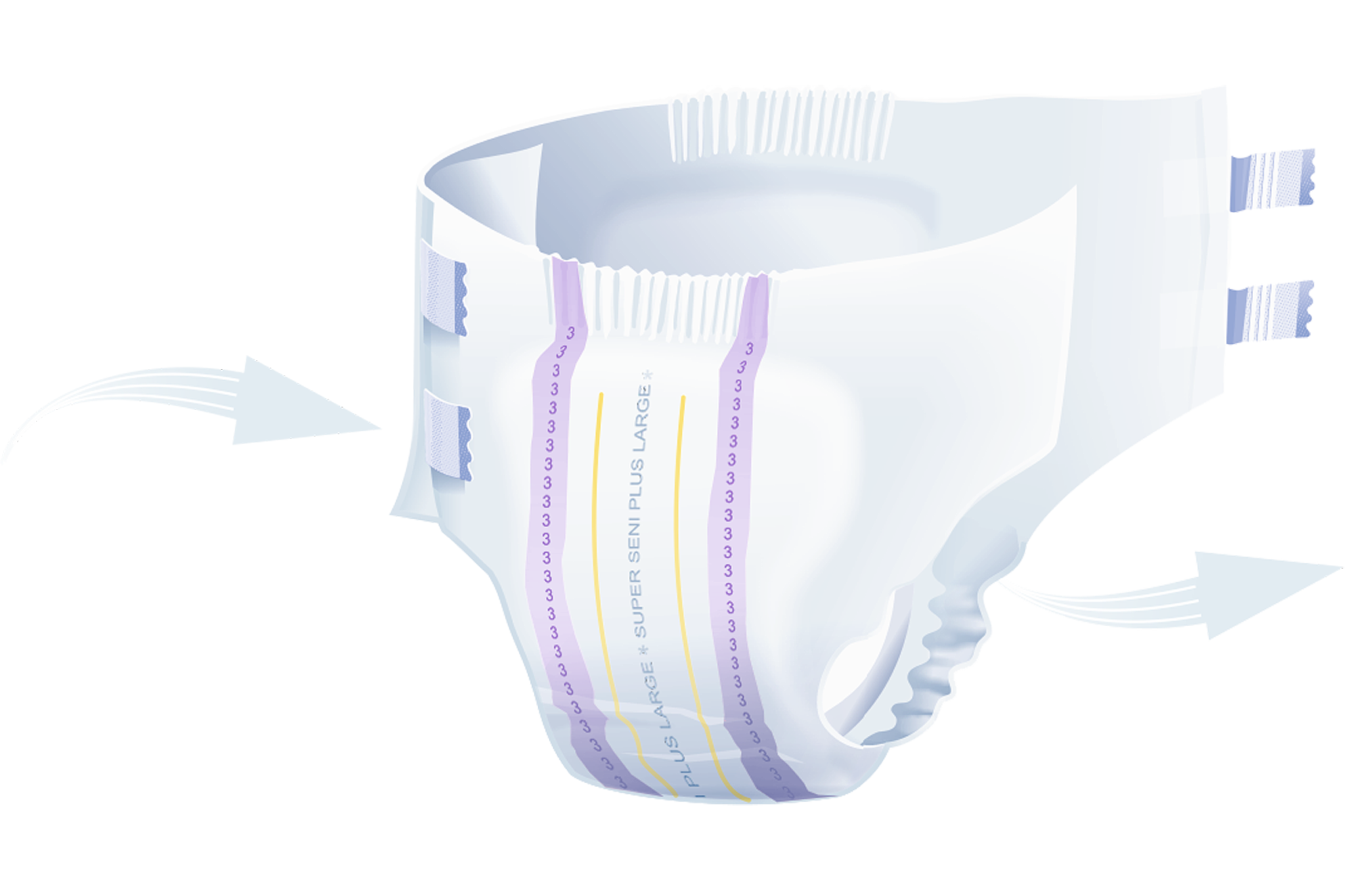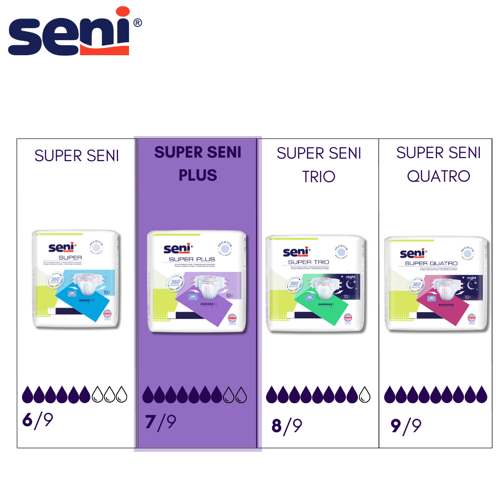 Scutecele Super Seni Plus pot fi folosite şi pentru incontinenţa mixtă (urinară şi fecală). Scutecele Super Seni Plus au indicator de umiditate, banda imprimată pe stratul exterior, ce se colorează în contact cu urina şi informează despre necesitatea schimbării scutecului.